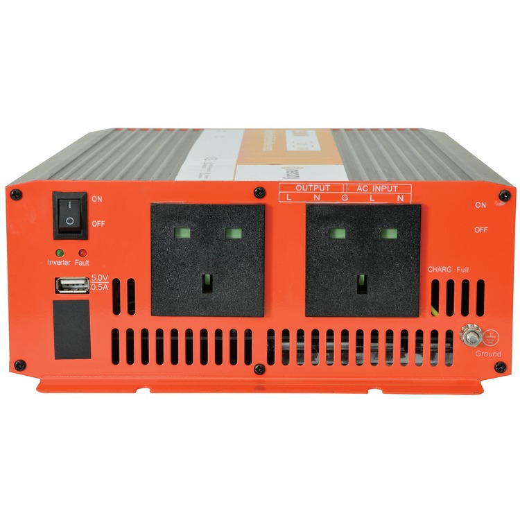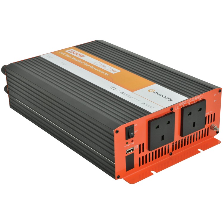 This 2500W high efficiency power inverter uses a modified sine wave to power 230V mains equipment and USB power from a 12V battery or DC power supply.