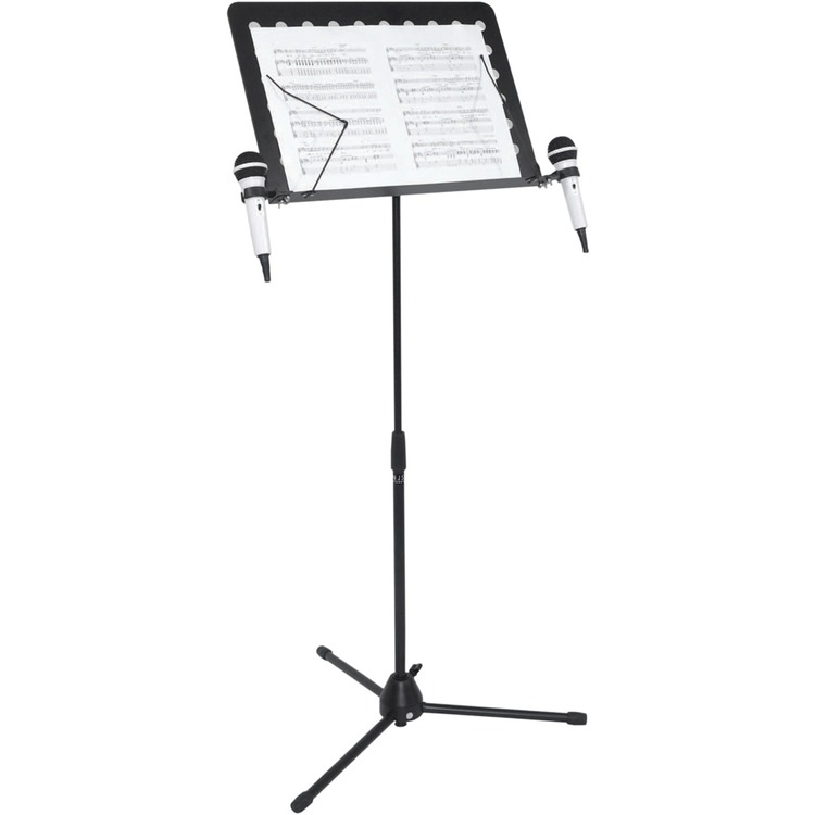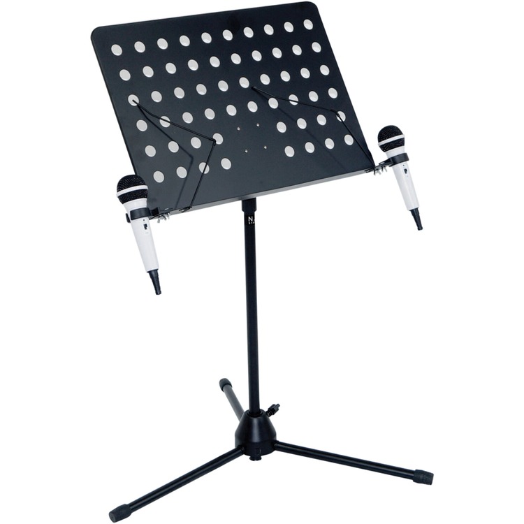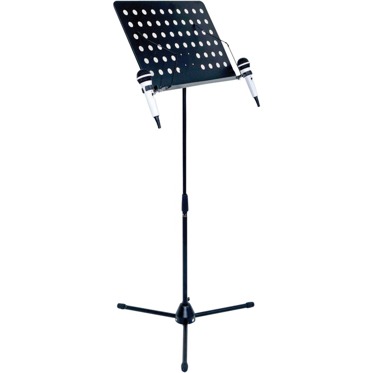 Professional conductor/sheet music stand fitted with two microphone holders and tripod style foldaway legs.