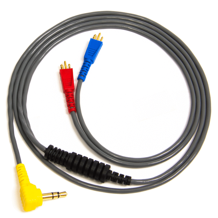 This cable has two 3-pin Europlug direct audio input plugs (one red, one blue) on one end and a standard 3.5mm stereo plug (yellow) on the other end. The Europlug connector plugs into the socket on the FM battery cover (purchased separately) and the yellow plug connects into the audio device.