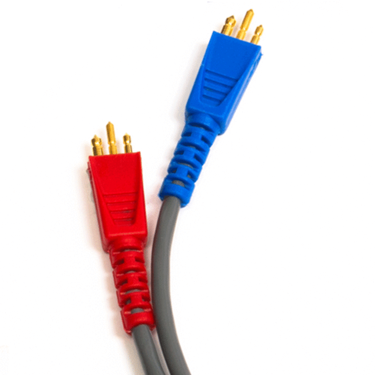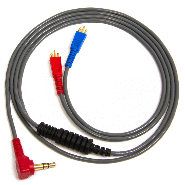 This cable has two 3-pin Europlug direct audio input plugs (one red, one blue) on one end and a standard 3.5mm stereo plug (red) on the other end. The Europlug connectors plug into the socket on the FM battery covers (purchased separately) and the yellow plug connects into the audio device.